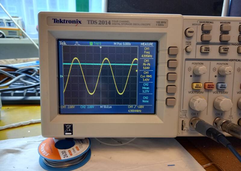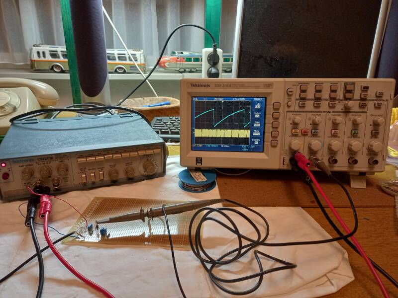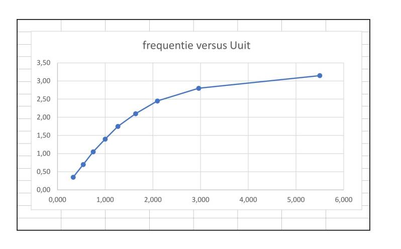 Door de functiegenerator op 10 Vpp te zetten en de frequentie te variëren varieert de gelijkspanning aan de uitgang van de schakeling.