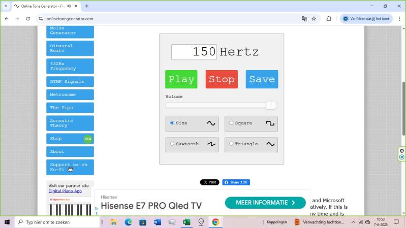 Computer: Zet de online toongenerator https://onlinetonegenerator.com/ aan op 150 Hz, en zet het geluidsvolume zodat de bromtoon hoorbaar is.
