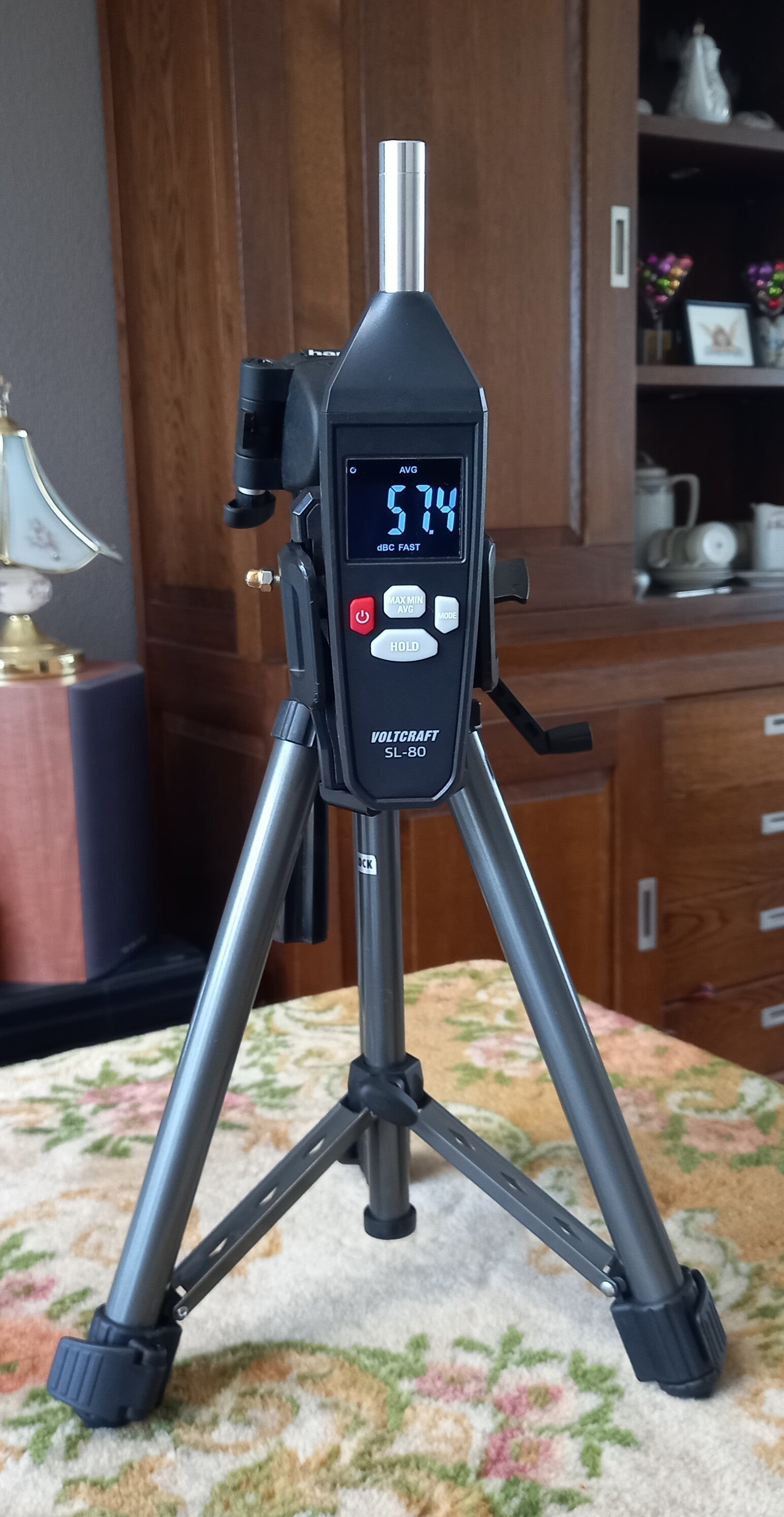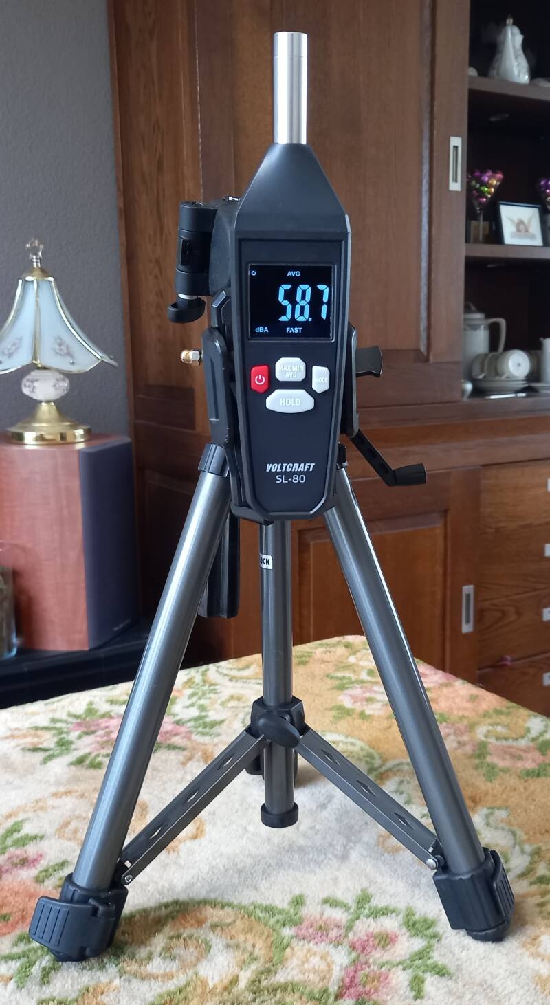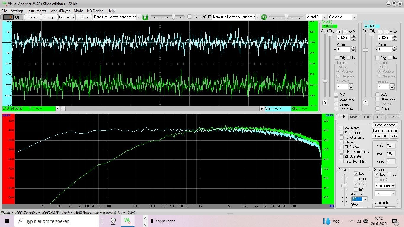 De dB meter staat ingesteld op de A weging, dit is de groene curve op de spectrum analyzer.